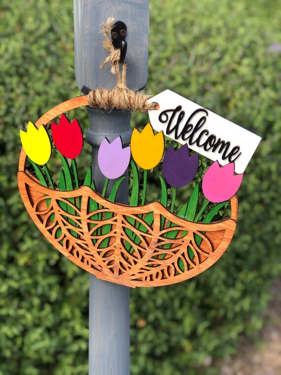 Wooden Basket Of Tulips Door Hanger 17 Etsy